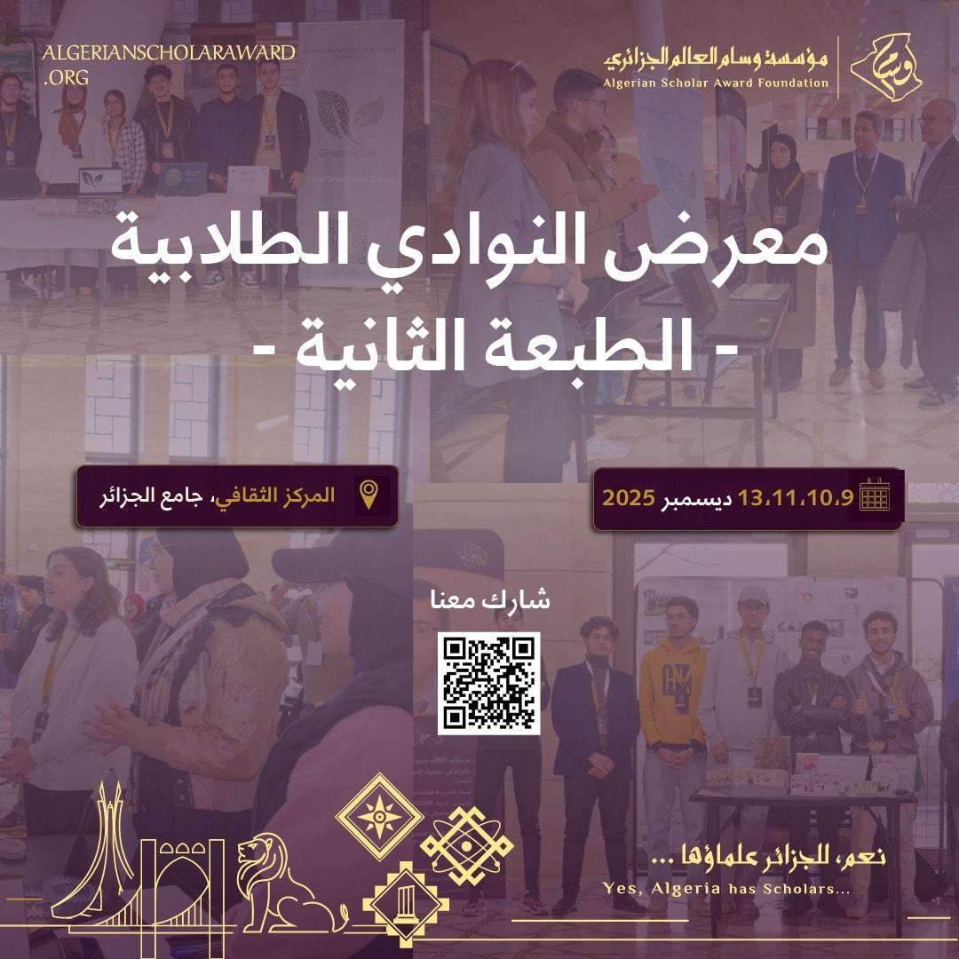 تُعلن مؤسّسة وسام العالِم الجزائري عن تنظيم الطّبعة الثانية من معرض النوادي الطلَّابية، وذلك أيام 9، 10 و11 ديسمبر 2025م بالمركز الثقافي لجامع الجزائر.