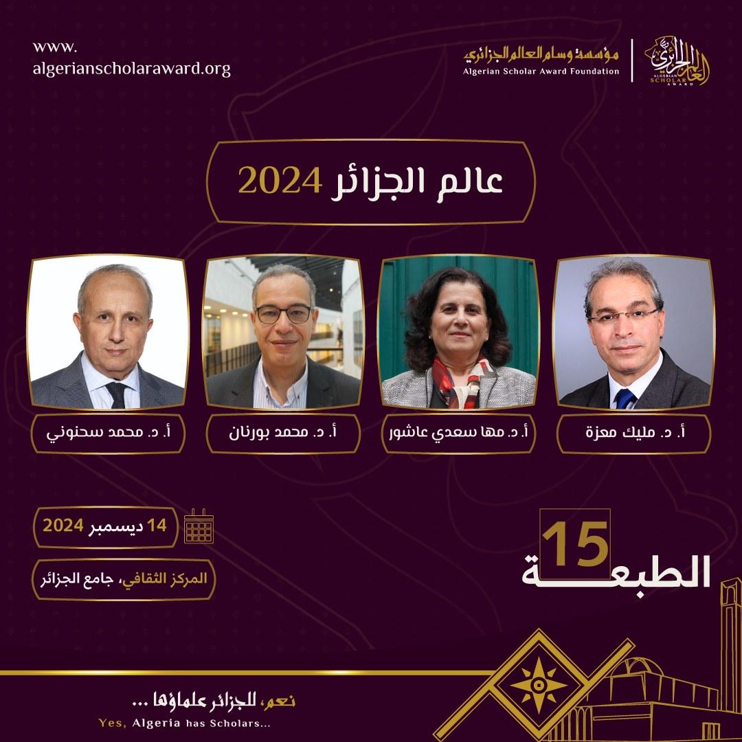 مناسبة الطبعة الخامسة عشرة من وسام العالم الجزائري، يسعدنا الإعلان عن العلماء المُكرَّمين لعام 2024: