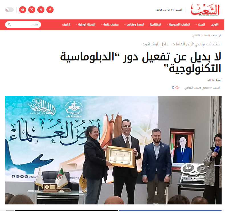 استضاف برنامج “أرض العلماء”، في عدده الرابع، الباحث الجزائري وعضو الأكاديمية الجزائرية للعلوم والتكنولوجيا، الأستاذ الدكتور عادل بلوشراني، وذلك في إطار الشراكة بين الإذاعة الجزائرية ومؤسسة وسام العالم الجزائري. وبُثّ اللقاء مباشرة من النادي الثقافي “عيسى مسعودي” على القناة الأولى، بحضور جمع من الإطارات العلمية والطلبة الباحثين الذين ملؤوا القاعة بشغف المعرفة وفضول البحث.