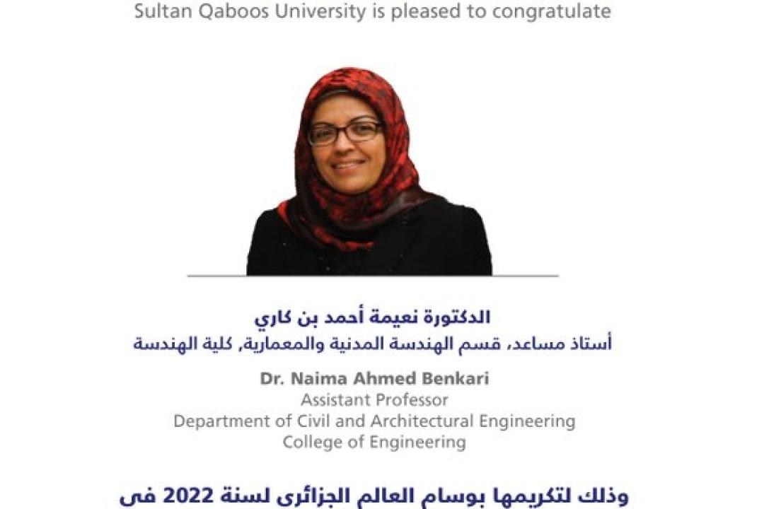 تفخر جامعة_السلطان_قابوس بالدكتورة نعيمة أحمد بن كاري بمناسبة تكريمها بوسام العالم الجزائري في طبعته الثانية عشر.