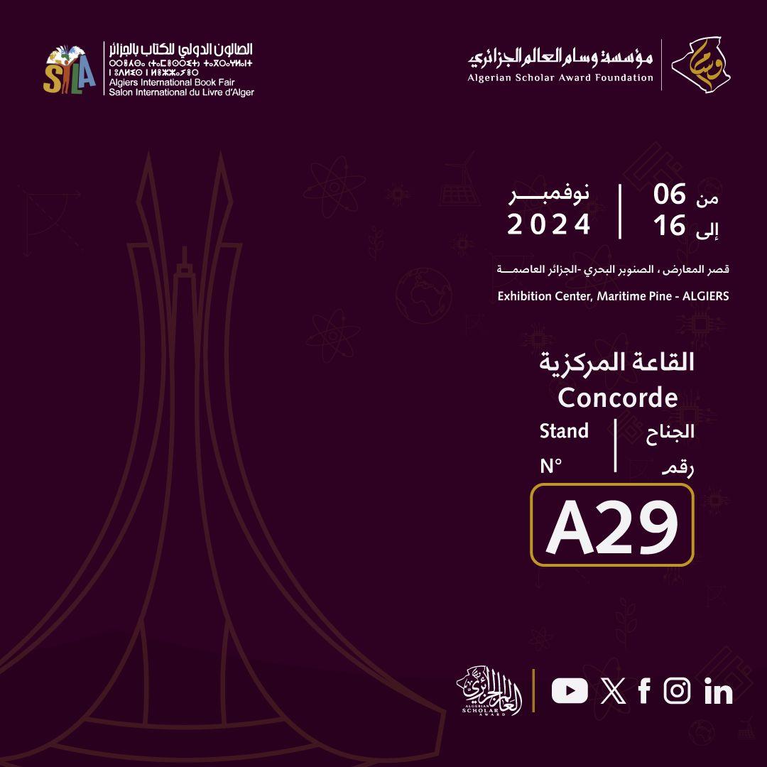 مرحبا بكم في الصالون الدّولي 27 للكتاب بالجزائر 2024، نحن متواجدون في القاعة المركزية Concorde بالجناح A29، من 06 نوفمبر إلى غاية 16 نوفمبر2024