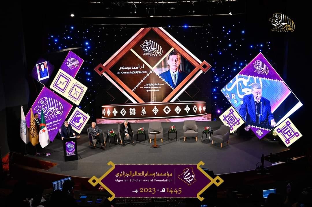 أول المكرمين، البروفيسور أحمد موساوي، "العالم في محرابه"، الذي كرّس حياته للعلم والمعرفة، نشاهد العرض الموثّق ونبصر عَيانا عالم المنطق وهو يحكي قصة جهاده في العلم، ويروي رحلته التي مرت عبر السوربون والإمارات من غير أن تُغْريَه واحدة عن بلده، ليتمم المسيرة بالعمل والتفاني في بلاده أرض المليون ونصف المليون شهيد أرض الجزائر.. أحمد موساوي أول من يتحصل على دكتوراه دولة في المنطق، وقد ترجم نصوصا منطقية نفيسة وحققها، وأنجز أعمالا علمية عميقة وأتقن فيها، على غرار معجم المناطقة الذي جعله موسوعة... وقد صعد إلى المنصة ليلقي كلمته بالمناسبة، فكان الحديث عن النقلة الإسلامية الفارقة للمنطق البشري، ومن لم يكن يعرف عمق طرح البروفيسور قد أدركه الآن..