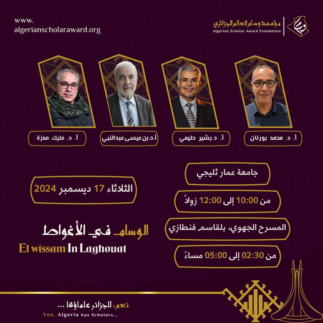 في إطار التكريم المستمر لعلمائنا الأجلاء، ندعوكم لحضور فعاليات الوسام في الأغواط يوم الثلاثاء 17 ديسمبر 2024.