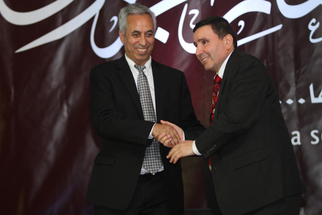 ليقوم بعد ذلك الأستاذ أحمد جبار -باعتباره آخر مكرم- بتسليم الوسام المشعل للبروفيسور بلقاسم حبة لينضم إلى المجموعة ويواصل الرسالة.