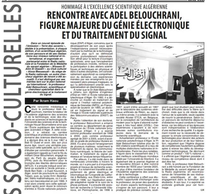 Dans un nouvel épisode de l’émission « Terre des savants », dédiée à la présentation, à chaque édition, d’un scientifique algérien, de son parcours et de ses réalisations aux niveaux national et international, et organisée en partenariat entre la Radio nationale et la Fondation de la Médaille du savant algérien « Wissam El Alim El Djazaïri » au Club culturel « Aïssa Messaoudi » du siège de la Radio nationale, un autre chercheur algérien de renom a été accueilli. Il s’est distingué par ses mérites tant sur le plan national qu’international : le professeur Adel Belouchrani, scientifique et chercheur spécialisé dans le génie électronique et le traitement du signal.